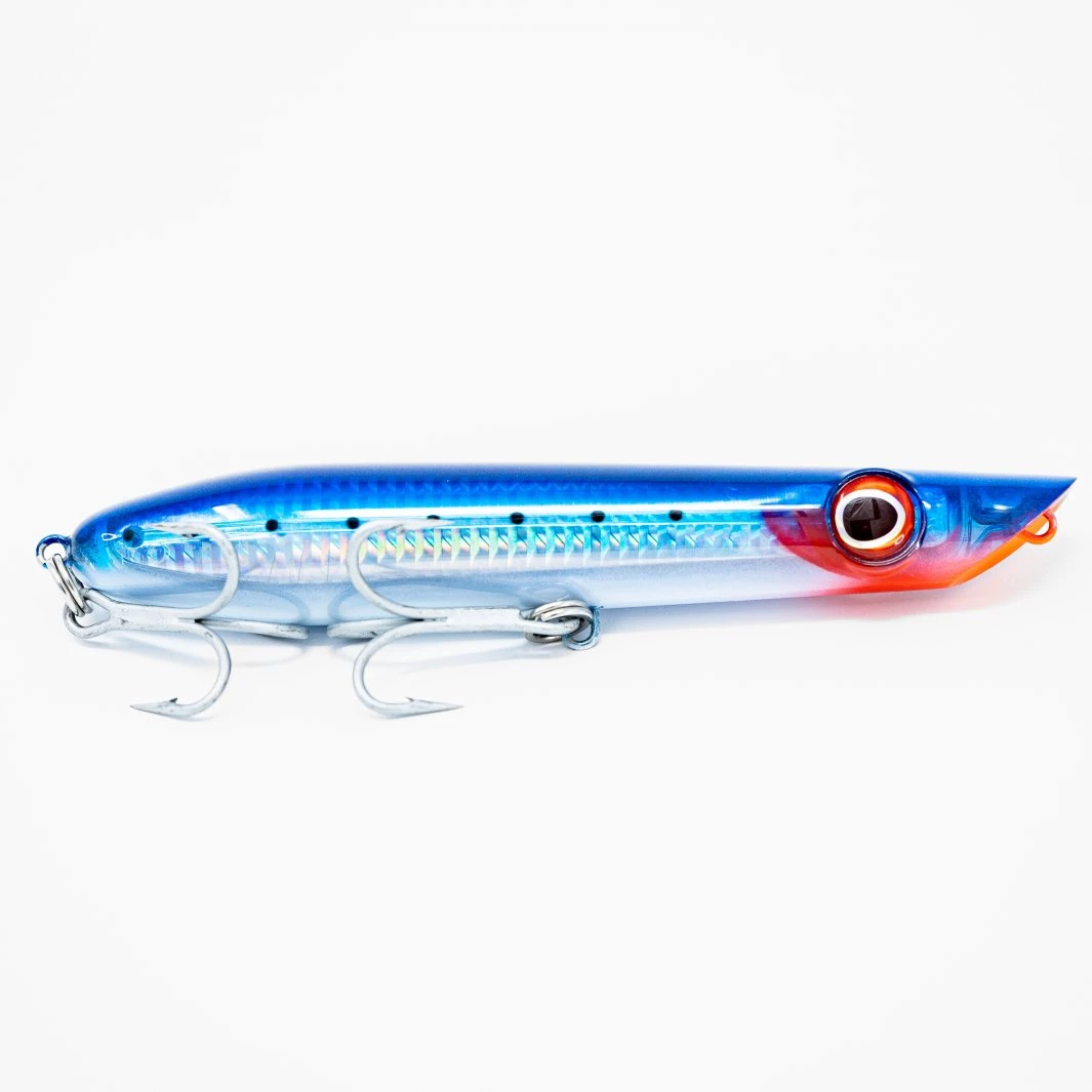 Dark Matter Pencil Poppers are available in 4 3/4″ 7/8 oz, 6″ 1 5/8 oz, 6 3/4″ 2 1/3 oz and 6 3/4″ 2.6 ozs. Choose from three great colors: Blue/Silver, White/Silver and Yellow/Silver. All three colors are holographic.